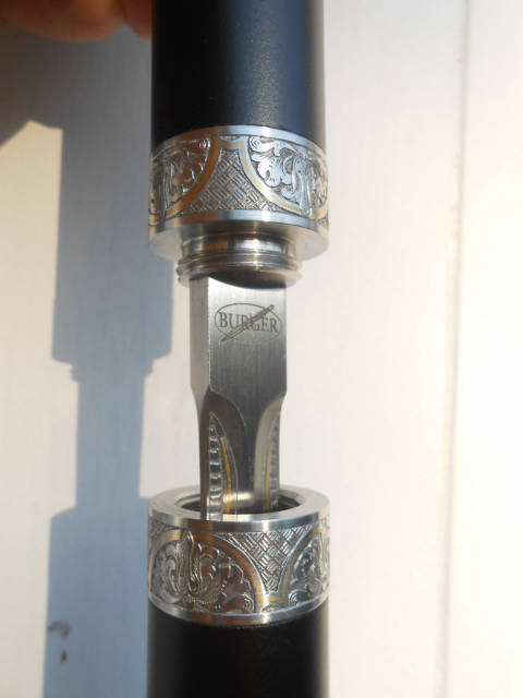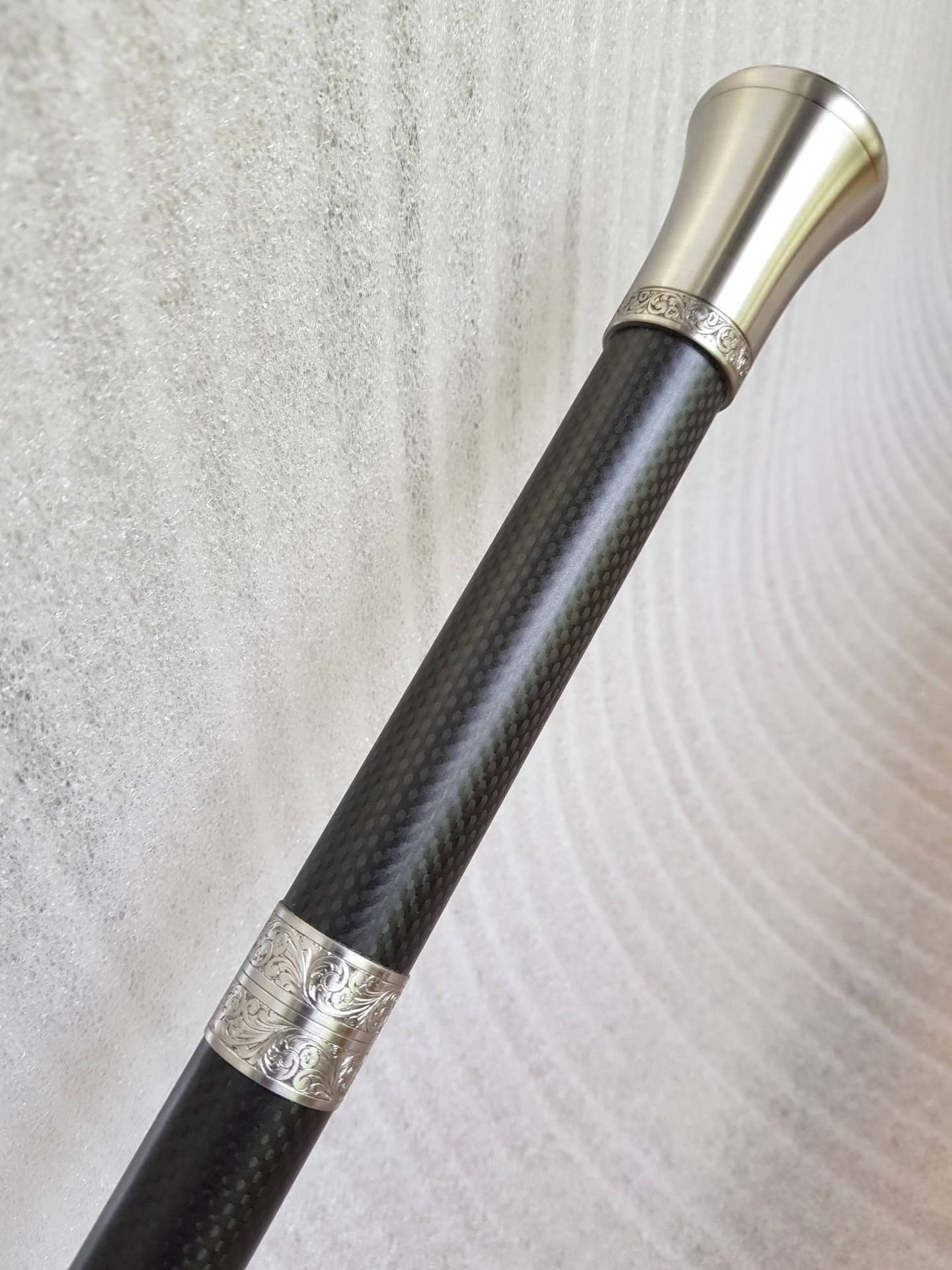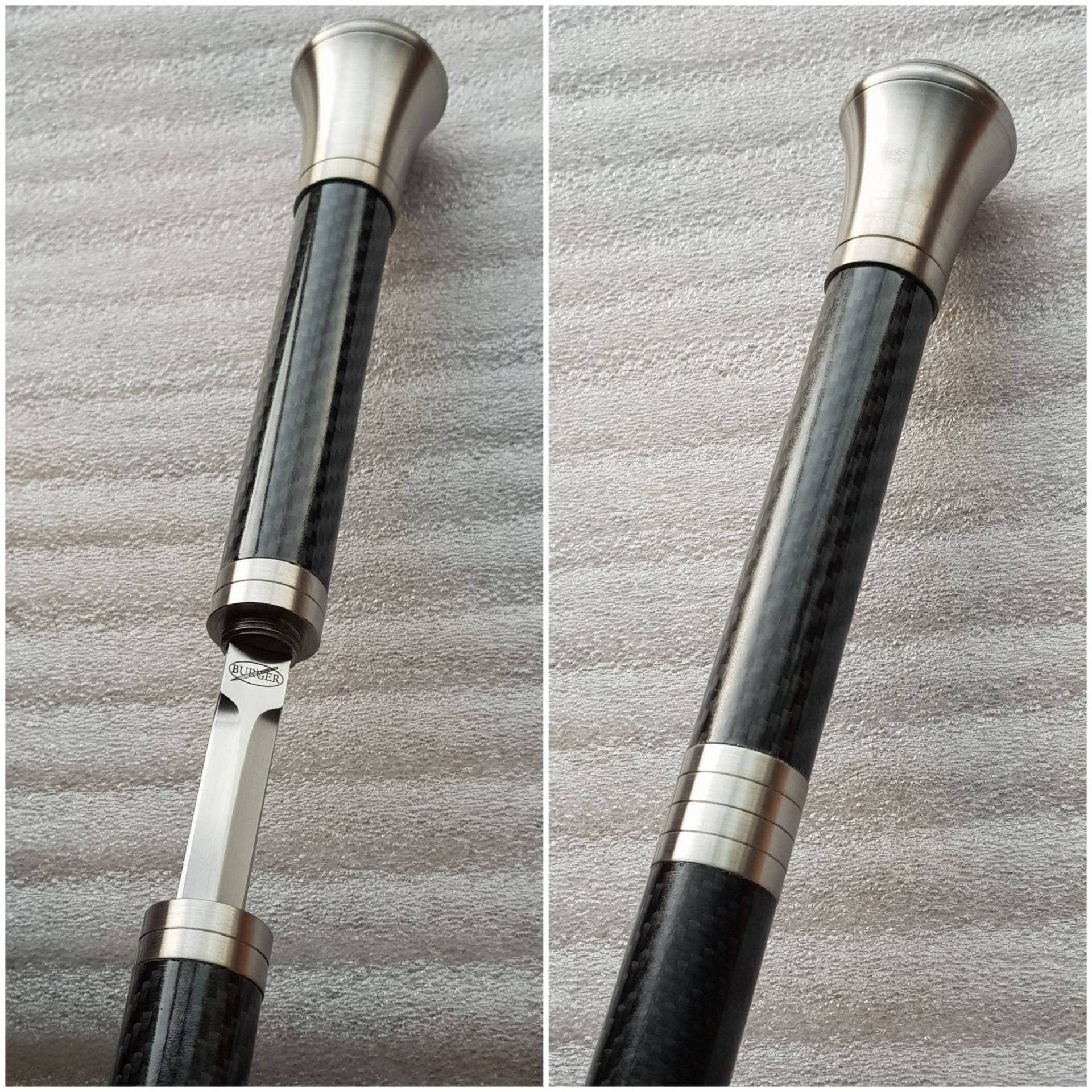 Incorporating the same beautiful rapier style double edged blade as found in the MK2 & Country Cane sword cane range. The Hiker Staff incorporates the larger diameter (26mm) carbon composite shaft in matt black or woven carbon finish (woven carbon option adds $110-) and with a multi surface ferrule (tip). The standard Hiker Staff comes with our very popular, Turned Tamboti handle. And with the unique short thread locking action collars in 303 s/s allowing the blade to be extracted with two and a quarter quick turns of the handle. Offering a very secure, discreet, rugged and rattle free functionality to this hardworking Hiker Staff design. The perfect companion when you find yourself OFF the beaten track!!